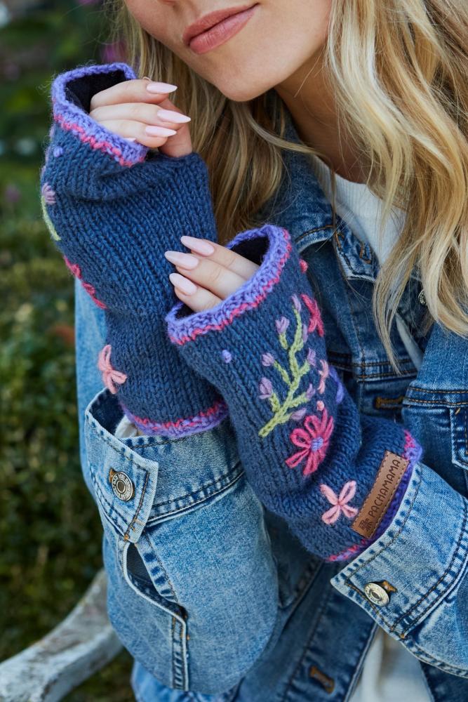 Handwarmers / fingerless gloves with embroidered flowers. Fair trade and handmade in Nepal.