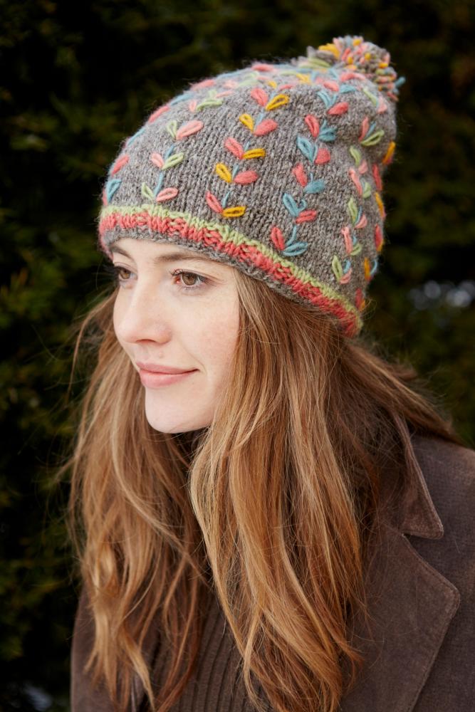 This Kylemore bobble beanie hat is beautifully embroidered with simple leaf patterns inspired by nature. It is handknitted in wool in autumn hues and hand crafted with care. The fleece lining is sure to keep you warm and cosy.