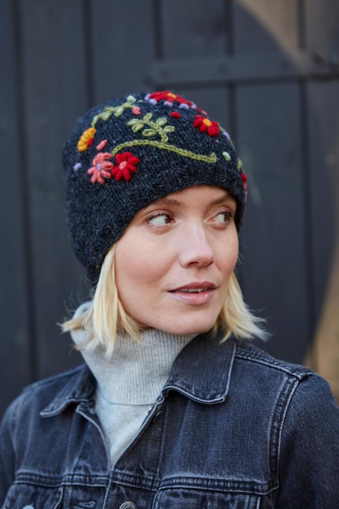 This hand knitted wool beanie hat features beautifully hand embroidered flowers in striking colours.