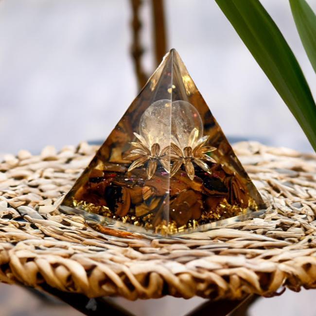Orgone pyramid tiger eye crystal quartz sphere on lotus