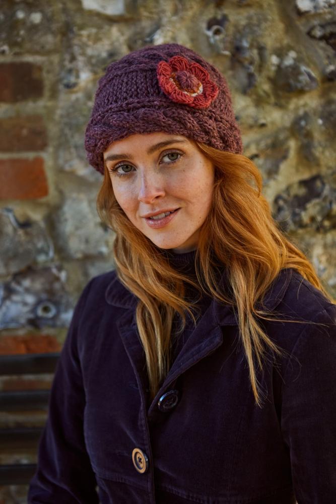 Handmade cable knit beanie hat with a crochet colourful flower.