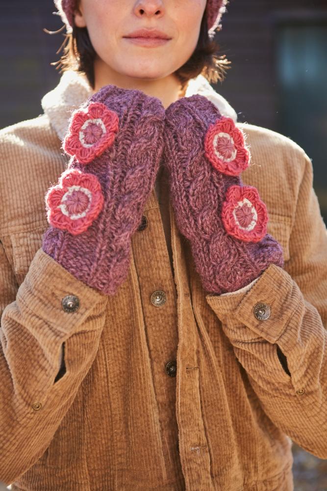 Handmade cable knit fingerless cloves with a crochet colourful flower.