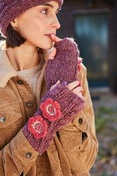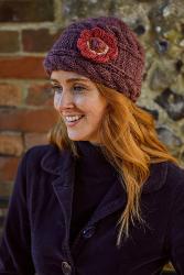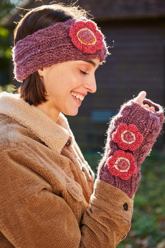 Handmade cable knit headwarmer with a crochet colourful flower.